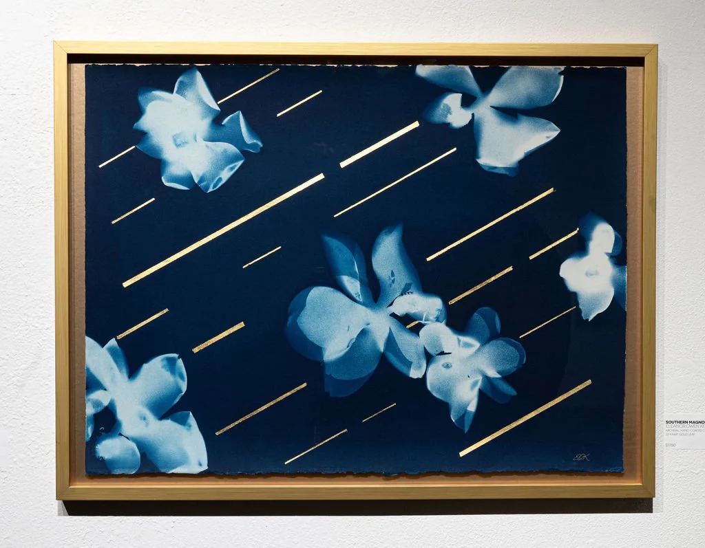 The prints, made by directly exposing botanical elements to the sun, record rapid changes in the materials and capture ephemeral suggestions rather than literal depictions. For me, the blue of the cyanotypes conjures associations with the infinite. It becomes a field where earthly forms appear, dissolve and reconfigure - a space where emotion and imagination can take hold. Gold leaf, a counterpoint to the ephemeral, marks thresholds or passages. Together, the elemental and organic materials explore a dialogue between the transient and the timeless, the tactile and the luminous.